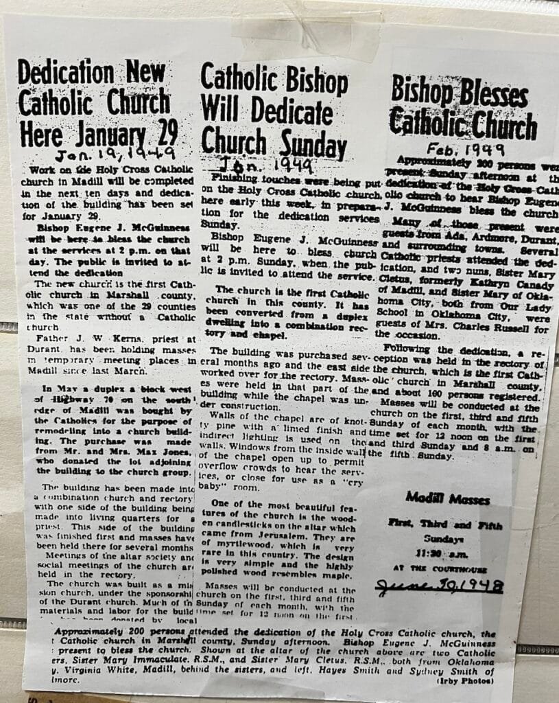 His Excellency, Bishop Eugene J. McGuinness, blessed the first Catholic Church and rectory in Marshall county on Sunday, Jan. 29, 1949. It was Holy Cross church in Madill. It was constructed under the supervision of Father J. W. Kerns, pastor of Durant and the mission of Madill.