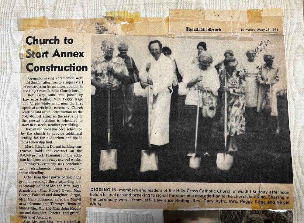 In September 1949, a very active altar society was organized by Father Kerns in Madill. The following officers were elected: Mrs. Julia Owens, president; Mrs. Fayette Walker, vice-president; and Miss Mary Catherine Criswell, secretary-treasurer. Some of the charter members of the altar society besides the officers were Mrs. Russell, Mrs. Sadie Criswell and Mrs. Osterhaus.